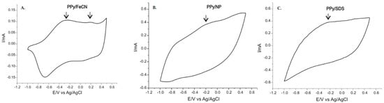 Responses of sensors modified with PPy immersed in a 0.1 M KCl and 10−3 M L-Tyr la 0.1 V × s−1 solution: (A) PPy/FeCN-SPCE, (B) PPy/NP-SPCE, and (C) PPy/SDS-SPCE [27].