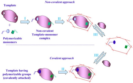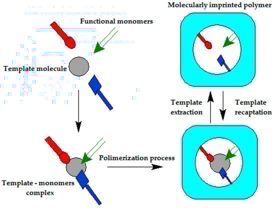 Generally, MIPs are stable, and resistant to various pH values and temperatures, but are also in various solvents [96]. Another advantage of MIPs is their relatively simple and inexpensive synthesis, which represents an alternative in using natural biological receivers [121]. Due to their affinity and selectivity, MIPs have proved to be adequate receivers for various organic and biological species such as enzymes and antibodies, and, in recent years, they have been used to manufacture electrochemical sensors and biosensors, a model for preparation being given in Figure 7 [42].
