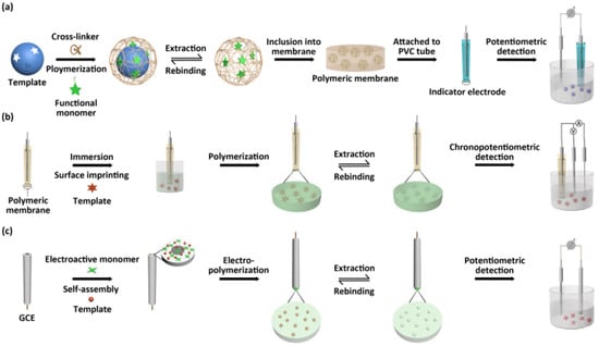 Typical manufacturing of MIP potentiometric sensors with polymeric membranes, through three processes: MIP incorporation (a), MIP covering (b), and MIP electropolymerized (c). Reprinted with permission from [42].