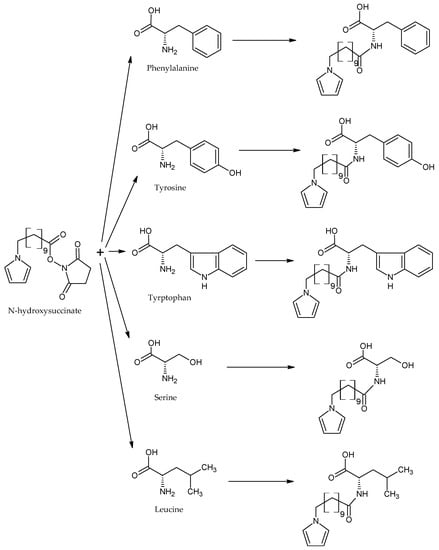 Regarding the AAs tackled in this present study, A. Nan et al. reported (in a paper published in 2000) the synthesis and characterization of hybrid magnetic nanostructures for the analysis of AAs: Phe, Tyr, Trypt, leucine, and serine—used to functionalize the pyrrole monomer, being linked through various types of hydrophobic linkers in the azoth atom of the pyrrole monomer [50]. The methods for the characterization of these nanostructures were FTIR spectroscopy, transmission electronic microscopy (TEM), and magnetic measurements. N-hydroxyl succinate was the precursor used to obtain the monomers of pyrrole functionalized with AA, as shown in Figure 8.