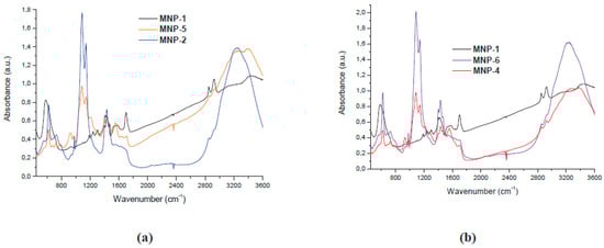 FTIR spectra of (a) tryptophan functionalized MNP-2, serine functionalized MNP-5, and (b) phenylalanine MNP-4 and tyrosine MNP-6. Reprinted with permission from [50].