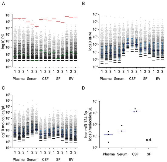 - Godoy, P.M.; Bhakta, N.R.; Barczak, A.J.; Cakmak, H.; Fisher, S.; MacKenzie, T.C.; Patel, T.; Price, R.W.; Smith, J.F.; Woodruff, P.G.; et al. Large differences in small RNA composition between human biofluids. Cell Rep. 2018, 25, 1346–1358. [Google Scholar] [CrossRef] [PubMed]