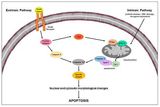 Apoptosis is a highly complex process that involves different cascades of molecular events. Two main pathways are known: the extrinsic or death receptor pathway and the intrinsic or mitochondrial pathway [8,9] (Figure 1). They are carried out by caspases, a family of cysteine-dependent aspartate-directed proteases that cleave specific target proteins (e.g., Parp-1) [10,11]. Each apoptotic pathway activates its own initiator caspase (e.g., caspase 8 for extrinsic pathway; caspase 9 for intrinsic pathway) which in turn activate the executioner caspase (e.g., 3 or 7) resulting in nuclear and cytosolic morphological changes and finally in cell death [11].