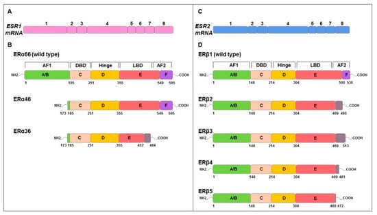 E2 effects are mediated by ERα and ERβ which are coded by ESR1 and ESR2 genes, respectively. They have a molecular structure of six protein domains, denoted as A to F, encoded by eight exons, which differ in their functions: domain with ligand-independent activation function (AF1) at the N-terminus (A/B domain), DNA-binding domain (DBD, C domain), hinge domain (D domain) containing nuclear localization signals, E/F domains including ligand-binding domain (LBD), and the activation function 2 (AF2) with hormone-dependent activity and agonist/antagonist regulator sites [41,42,43] (Figure 2). ERs possess a similar structure and share considerable homology in both DBD and LBD [41]. Alternative mRNA splicing mechanisms differentially regulate ERs isoforms expression producing different variants (ERα66/46/36; ERβ1/2/3/4/5) (Figure 2) with specific ligand binding, subcellular localization, response to post-translational modification and both ligand-dependent and -independent functions [41,43].