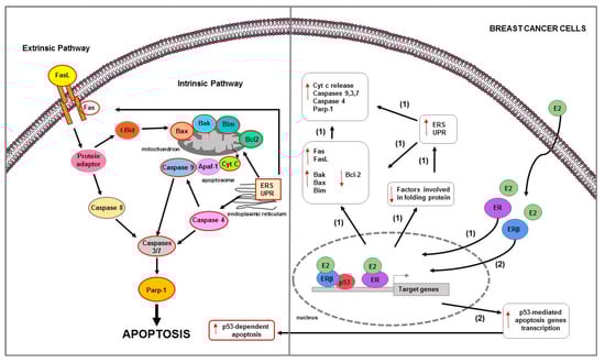 Molecular mechanisms activated by ERs and involved in BC cells apoptosis regulation.