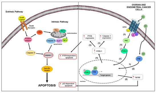 Main mechanisms of estrogen-induced apoptosis in ovarian and endometrial cancer cells. On the right side of the figure, the main transcriptional mechanisms mediated by ERs are indicated; on the left side, an illustration of apoptotic pathway (highlighted by the red outline) and its consequent activated is shown. ERβ genomic and GPER non genomic signaling are involved in apoptosis of OC cells (1). In EC cells (2) ERβ expression is associated with TAF9B mRNA increase. The red arrows pointing up indicate activation and/or expression increase. See text for more details. P: phosphate group.