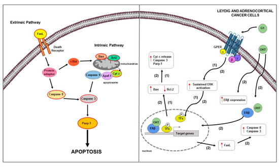 Main mechanisms of estrogen-induced apoptosis in Leydig and adrenocortical cancer cells. On the right side of the figure, the main transcriptional mechanisms mediated by ERs are indicated; on the left side, an illustration of how the apoptotic pathway (highlighted by the red outline) consequently activated is shown. GPER activation by G1 triggers a mitochondrion-dependent apoptotic pathway in both LCT (1) and ACC (2) cells. In ACC (2), OHT, by ERβ upregulation, also increases the FasL expression and caspase 8 and 3 activation. The red arrows pointing up indicate activation and/or expression increase, while those pointing down indicate inhibition and/or expression decrease. See text for more details. P: phosphate group.
