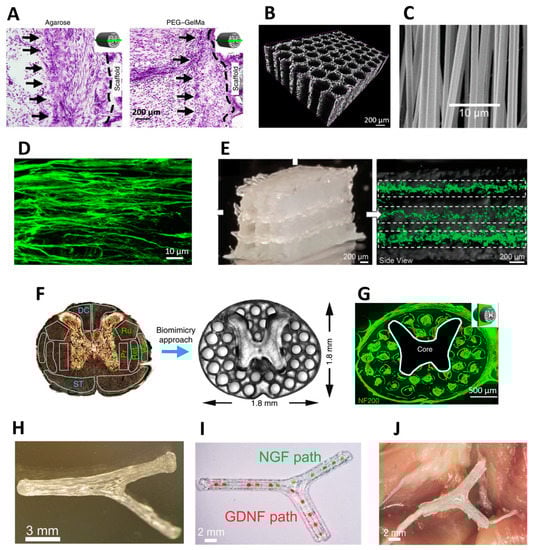 - Gros, T.; Sakamoto, J.S.; Blesch, A.; Havton, L.A.; Tuszynski, M.H. Regeneration of long-tract axons through sites of spinal cord injury using templated agarose scaffolds. Biomaterials 2010, 31, 6719–6729. [Google Scholar] [CrossRef] [PubMed]