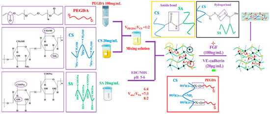 Briefly, 0.2 g CS was dissolved in 10 mL 0.1 M glacial acetic acid, 1 g PEGDA was dissolved in 10 mL 0.01 M phosphate buffered saline (PBS), and 0.2 g SA was dissolved in 10 mL 0.05 M sodium bicarbonate (NaHCO3). Subsequently, PEGDA was added to CS and formed a mixing solution. Then, the mixing solution was added to SA with the catalyzed EDC/NHS.