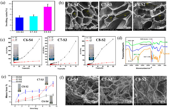 After immersing in PBS for 11 days, the hydrogels condition was taken photos (Figure 2e). For the C6-S4 sample, the hydrogel was almost complete and maintained a non-flowing state. In contrast, for C7-S3 and C8-S2 samples, the hydrogel resolved in PBS with large pieces of gels and represented a flowing state. Degradation tests were used to determine the Degradation ratio (DR) of the complex hydrogels. Firstly, the complex hydrogels were immersed in 0.01 M PBS at 37 °C with shaking at 70 rpm until the weight of all hydrogels was kept constant and the weight were denoted as W0. At the predetermined time, the hydrogels were taken out, rinsed using RO water to remove excess salinity, the superficial water of gels were removed by filter paper, and the weight was denoted as W′. DR of hydrogels was analyzed by the formula: DR = (W0 − W′)/W0 × 100%. According to the calculation, for C6-S4, C7-S3 and C8-S2 hydrogel, the mass loss was 15.18%, 24.99% and 42.81% after degradation for 5 days, respectively. Similarly, for C6-S4, C7-S3 and C8-S2 hydrogel, the mass loss was 27.40%, 64.88% and 73.73% after degradation for 11 days, respectively (Figure 2e).