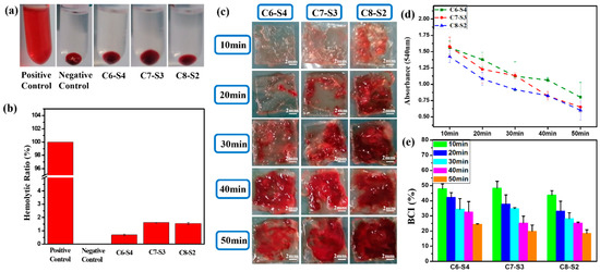 The whole blood dynamic coagulation assay was carried out to detect the coagulation after the blood was connected to the hydrogels. After the hydrogel was connected to the blood for 10, 20, 30, 40 and 50 min, the blood clots that coagulated on hydrogels were showed in Figure 3c. For C6-S4 hydrogels, there were hardly any blood clots within 20 min, only a tiny amount of blood clots was formed during 20–30 min, and mass of blood clots began to form after 30 min. These results implied that the formation of large blood clots was postponed to 30 min after the hydrogel connected to the blood for C6-S4. In contrast, for C8-S2 hydrogel, there were few blood clots after the hydrogel connected to the blood for 10 min. After that, more and more blood clots began to form, which means the significant coagulation reaction occurred after 10 min connection. Figure 3d showed the absorbance of hydrogels at different point times. As time went by, more and more blood involved in the coagulation reaction; the uncoagulated blood became less and led to a lower absorbance. Therefore, the lower the absorbance, the better the coagulation effect. The blood coagulant index (BCI) of hydrogels were analyzed by the following formula: As/Aw × 100%. After the connection of 10 min, the BCI of all hydrogels were above 40%, which exhibited soft coagulation and prevented the blockage of capillaries (Figure 3e). Ten minutes later, the C8-S2 hydrogels began to form blood clots to prevent the hemorrhage of large vessels.