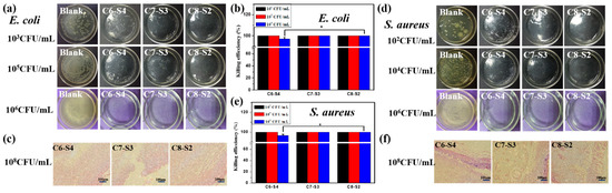 The in vivo antibacterial activities of complex hydrogels against E. coli and S. aureus were evaluated via rats’ full-thickness infected skin defect model. After adding the bacterial suspension to the defected skin for 30 min, hydrogel dressing was covered to the defected skin for 24 h, and the wound tissues were harvested and stained by the gram. The tissue containing E. coli could appear red pattern, the tissue containing S.aureus could appear bluish violet pattern, and the healthy tissue could appear pink pattern. The more red or bluish violet patterns, the more E. coli or S. aureus bacteria. For E. coli groups, no red pattern appeared on all the hydrogel groups, suggesting the excellent antibacterial property against E. coli (Figure 4c). For S. aureus groups, there were little bluish violet patterns on the C6-S4 hydrogel group, and there were scarcely any bluish violet patterns on the C8-S2 hydrogel group (Figure 4f). Therefore, C8-S2 hydrogel showed better antibacterial properties than the C6-S4 hydrogel group against S. aureus.