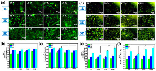 To further evaluate the cytocompatibility of hydrogels, the L929 cells and ECs were encapsulated into the hydrogels. The morphology of adherent cells was stained by rhodamine 123, and the number of cells was detected by CCK-8 assay. As showed in Figure 5a, the morphology of endothelial cells on a tissue culture plate (TCP) showed a typical cobblestone shape morphology. However, the morphology of endothelial cells on hydrogels (C6-S4, C7-S3 and C8-S2) showed a spheroidal morphology and un-spread state (Figure 5a). In terms of cell viability, all the hydrogel groups showed no apparent difference within five days (Figure 5b). However, in terms of the proliferation of cells, the C8-S2 hydrogel revealed better proliferation than the C6-S4 hydrogel (Figure 5c). The morphology of L929 in hydrogels was also analogous with the EC, which exhibited spherical and non-spread shape (Figure 5d). For the culture of L929, the C8-S2 hydrogel exhibited a significant difference with the C6-S4 hydrogel in the aspects of cell viability and proliferation (Figure 5e,f), indicating the promoting effect of chitosan on cell proliferation.