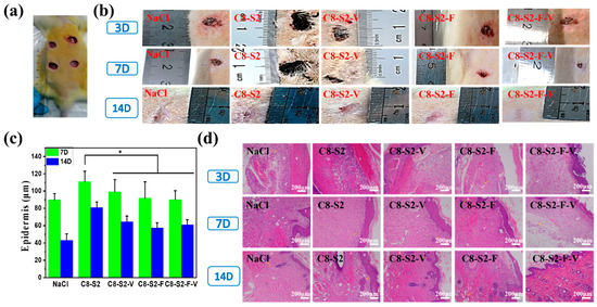 To further evaluate the healing process of wound skin, a full-thickness infected skin-defect rat model (Figure 7a) were prepared, and histological analysis was performed. As time went by, the wound areas gradually became smaller (Figure 7b). Specifically, for groups hydrogel with factors (C8-S2-V, C8-S2-F and C8-S2-F-V), the wound areas were smaller than the primary hydrogel group (C8-S2) at 3, 7 and 14 days after surgery. Therefore, the percentage of wound closure of hydrogel with factors was higher than the pure hydrogel group. Additionally, compared to the NaCl group, the groups of hydrogels with factors showed complete and more appropriate epithelial thickness on the 14th day (Figure 7c). The epidermal thickness of hydrogel with factors was closer to normal healthy tissue (70–120 μm). For further insight into wound regeneration, hematoxylin eosin (H&E) staining was performed to analyze the changes of epidermal, dermis, skin appendages and new blood vessels. By monitoring the wound site in the whole stages of wound healing (3–14 d), the inflammatory response reduced and no obvious inflammatory response for all the groups on the 7th day after surgery (Figure 7d). New blood vessels are crucial to wound healing by providing nutrients to the damaged sites. In general, new blood vessels and skin appendages like hair follicles were observed in all the groups. On day 14, the group for hydrogel with factors showed better-organized granulation tissue at wound microenvironment. As showed in Figure 7d, hydrogel groups exhibited more blood vessels and hair follicles than the NaCl group on the 14th day. These results indicated that the hydrogel groups, especially for C8-S2-F and C8-S2-F-V groups, were beneficial to extracellular matrix remodeling and tissue regeneration. Hydrogels with stereoscopic structure provide cells with three-dimensional growth, promote the interaction between biomolecules, cells and tissues and thus enhance the wound healing process. In addition, the micro-pores in the hydrogels make it easy for cells and nutrients to transportation and communication.