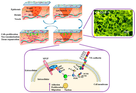 Growth factors belonging to the fibroblast growth factors (FGF) family play crucial roles in tissue repair and regeneration. The FGF family are small proteins and process a typical β-barrel structure as the core [30]. The FGF can be divided into three major groups: canonical, hormone-like, and intracellular. The FGF plays a vitally important role in tissue repair processes after mechanical injury, burns and chemical damage [31]. In general, the function of FGF includes stimulating cell proliferation and migration [32]. FGF could also enhancing angiogenesis which promote the formation of new vessels from pre-existing vessels [33,34]. FGFs can regulate many aspects of the cell phenotype, which is critical to tissue repair. For example, for endothelial cells, FGF2 could promote lifespan extension and angiogenesis, suppress apoptosis [35]. For fibroblasts, FGF2 could suppress their differentiation to myofibroblasts. Vascular endothelial cadherin (VE-cadherin) is an endothelial-specific marker expressed by endothelial cells during vasculogenesis [36] and a major component of endothelial adherens junctions. VE-cadherin is crucial for the organization of the newborn vascular network [37]. Besides, the function of VE-cadherin also includes promoting endothelial differentiation and mediating the interstitial mechanotransduction [38].