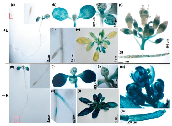 GUS staining pattern in different organs and tissues of AtTCH4 in Arabidopsis under different B conditions. (a–g) and (h–n) The transgenic plants were grown for 7 d at the seedling stage and 40 d at the flowering stage under B-sufficient (100 μM B) and B-deficient (0.1 μM B) conditions, respectively. (a,h) Whole seedling plants. The root tips in the red box are enlarged. (b,i) Cotyledon. (c,j) Leaf trichome. (d,k) Lateral root node. (e,l) Rosette leaf. (f,m) Flower. (g,n) Siliques.