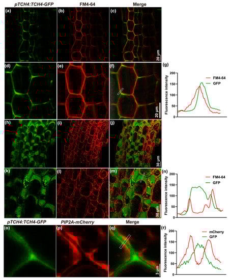 In order to construct the pTCH4:TCH4-GFP plasmid, the promoter and genome of TCH4 were amplified via PCR with the TCH4-GFP-1 and TCH4-GFP-2 primers successively (Supplementary Table S1) and then inserted into the rebuilt PBI121 vector at ScaI and SmaI restriction sites. pTCH4:TCH4-GFP transgenic plants were generated via the Agrobacterium-mediated floral-dip method []. For GFP observation, plants soaked in 4 μM FM4-64 with or without 0.4 g/mL sucrose for plasmolysis were observed by a Leica TCS SP8 confocal laser scanning microscope (www.leica-microsystems.com/home/ accessed on 1 November 2021). For GFP observation in Nicotiana benthamiana leaves, the pTCH4:TCH4-GFP and PIP2A-mCherry plasmids [] co-injected into tobacco leaves soaked with or without 0.4 g/mL sucrose for plasmolysis were inspected by confocal laser scanning microscopy.