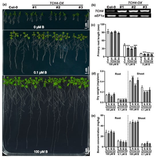 To determine whether TCH4 is involved in B-deficiency stress responses, three knockout lines of TCH4 (CR#1 carried a 1 bp insertion; CR#2 carried a 34 bp deletion; and CR#3 carried a 13 bp deletion) (Supplementary Figure S2a) were established by the CRISPR/Cas9 gene-editing system []. The wild-type and knockout plants had no significant differences in growth phenotype, primary root length, fresh weight, and dry weight regardless of B conditions at the seedling stage (Supplementary Figure S2b–e). There are 33 members of the XTH family in Arabidopsis thaliana []. The functional redundancy between TCH4 and other homologous genes cannot be ignored. We also established the overexpression lines of TCH4 in a wild-type Col-0 background (Figure 3b; Supplementary Figure S3). No evident difference in growth phenotype was observed between the wild-type and TCH4 overexpression (TCH4-OX) plants grown in normal B conditions (100 µM B) (Figure 3a). In contrast, the TCH4-OX plants presented more sensitivity to B-deficiency stress than the wild-type plants, showing reduced primary root length and dry weight (Figure 3a,c,d). Interestingly, TCH4-OX did not significantly affect the B concentration or other elemental concentrations in the plants (Figure 3e; Supplementary Figure S4). The results suggest that the distinct phenotype of TCH4-OX lines under B deficiency might be attributed to its function in cell wall modification.
