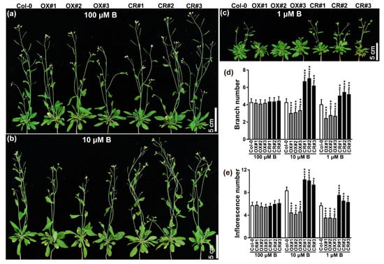 Considering the abundant expression of TCH4 in flowers and siliques, we assessed the effect of TCH4 activity on plant responses to B deficiency at the reproductive stage. The Col-0 and TCH4 transgenic lines were grown hydroponically under various B conditions during the reproductive stage for 30 d and 45 d, respectively. The shoot growth of all plants was inhibited under B-limited conditions relative to adequate B conditions (Figure 4a–c and Figure 5a–d). The TCH4-OX lines presented fewer branches and inflorescences than Col-0, while the TCH4 knockout lines developed more branches and inflorescences than Col-0 under 10 and 1 µM B conditions (Figure 4a–e). All plants developed a comparable number of branches and inflorescences at 100 µM B (Figure 4a,d,e). In particular, 1 µM B was not sufficient to complete the entire life cycle for all plants, leading to infertility (Figure 5a). At maturity, all plants can grow normally under 100 µM B, but not under 1 µM B (Figure 5a,d). At 10 µM B, the TCH4-OX lines hardly had normal siliques, while Col-0 grew normal siliques (Figure 5b,c). Under this condition, the TCH4 knockout lines presented a large number of siliques (Figure 5b,c). These results indicate that TCH4 participates in the reproductive growth regulation of Arabidopsis under B deficiency.