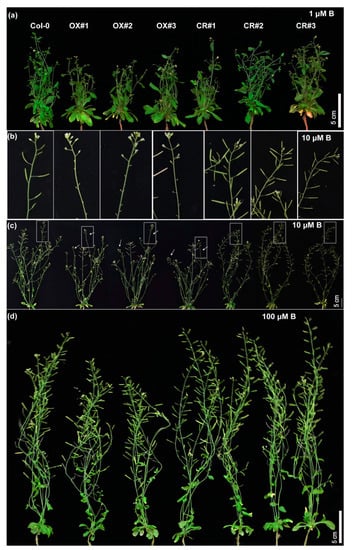 All wild-type and transgenic Arabidopsis thaliana plants in this study were from the Col-0 background. The experiments were carried out in plate cultures at the seedling stage, except that the extraction of the cell wall components and the phenotypic investigation of the flowering and maturity stages were cultured in a hydroponic system. The seeds were surface-sterilized and germinated for 10 d in media [] consisting of 1% sucrose and 1% gellan gum supplemented with different B concentrations after two days of vernalization at 4 °C. For the phenotypic investigation of the flowering and maturity stages, the seeds were sown on solid media consisting of 100 µMB for 8–10 d and then transferred to the hydroponic culture system with Hoagland and Arnon solution [] containing different B treatments. All plants were grown under controlled environmental conditions at 22/20 °C (light/dark), 300–320 μmol·m−2·s−1, and a 16/8 h (light/dark) photoperiod.