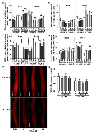 2-keto-3-deoxyoctonic acid (KDO) can be used to indicate the content of RG-II in cell wall pectin []. We further measured the content of KDO in chelator-soluble and alkali-soluble pectin. The data revealed that the KDO content of chelator-soluble pectin was increased by the B-deficient treatment in the wild-type Col-0 but not in TCH4-OX plants (Figure 6c). B-deficient treatment increased the KDO content of alkali-soluble pectin in the roots of wild-type Col-0 plants, while it decreased the KDO content of alkali-soluble pectin in the shoots of wild-type Col-0 plants (Figure 6d). The B concentrations had no significant effect on the KDO content of alkali-soluble pectin in the roots of TCH4-OX lines (Figure 6d). In contrast, B deficiency alleviated the reduction in KDO content of alkali-soluble pectin in TCH4-OX shoots compared to wild-type Col-0 plants (Figure 6d).