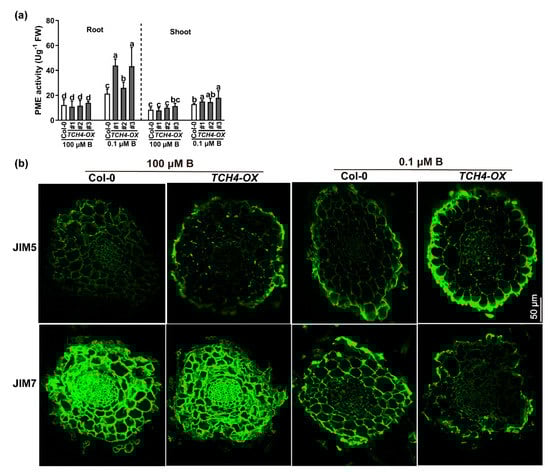 Pectin in the nascent cell wall is highly methylated and can be demethylated by pectin methylesterase (PME) []. The methylesterification degree of pectin can affect the cross-linking of pectin, thus influencing the compactness of the cell wall. We therefore determined the PME activities between Col-0 and TCH4-OX plants grown under adequate and low B conditions. We found that B deficiency increased the PME enzyme activities in both the roots and shoots, and PME enzyme activities in the TCH4-OX plants were higher than those in the wild-type Col-0 plants (Figure 7a). These results indicate that B deficiency might reduce the degree of pectin methylesterification. In parallel, we performed an immunohistochemistry experiment to compare the methylesterification degree of pectin between Col-0 and TCH4-OX plants grown in solid media under adequate B and B-deficient conditions for 10 d. A cross-section of roots was tested. The JIM5 antibody and the JIM7 antibody are extensively applied to evaluate low methyl-ester pectin and high methyl-ester pectin in plants, respectively []. Consistent with the results of PME enzyme activity, neither JIM5 nor JIM7 significantly labeled cell wall differences between Col-0 and TCH4-OX plants under adequate B conditions, but the immune intensity of JIM7 was more potent than that of JIM5 (Figure 7b; Supplementary Figure S5d). The B-deficient treatment reduced the JIM7 immune intensity, which was reduced more in TCH4-OX plants (Figure 7b; Supplementary Figure S5d). In contrast, JIM5 immune intensity was more evident in the TCH4-OX plants than in the Col-0 plants. These results illustrate that B deficiency reduces the methylesterification degree of pectin in the roots and that TCH4 functions in pectin demethylesterification.