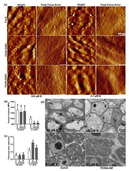 Cell wall characteristics of Col-0 and TCH4-OX lines in roots. The plants were grown in media consisting of 100 μM B and 0.1 μM B for 10 d. (a) Atomic force microscopy (AFM) revealing the cell wall’s surface characteristics and topography of the Col-0 and TCH4-OX lines in roots. The height and peak force error images are presented. Scale bar, 400 nm. (b,c) Young’s modulus (b) and the ratio of total pore area versus the total area were measured (c). The different letters above the columns indicate significant differences between all genotypes and all growth conditions (p ≤ 0.05). (d) Transmission electron microscopy (TEM) analysis of root meristem cells. Scale bar, 2 μm.