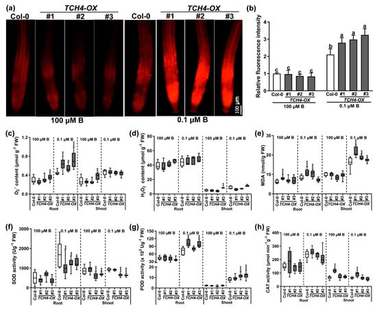 The accumulation of ROS is often accompanied by stress in plants. Hence, we analyzed the content of free oxygen radicals (O2−) and hydrogen peroxide (H2O2) in the Col-0 and TCH4-OX plants. Compared with adequate B conditions, the content of O2− increased in the roots, and the overexpression of TCH4 abundance intensified this under B-deficiency stress (Figure 9a,b). The content of O2− was further quantitatively determined. A similar result to that of DHE staining was observed in the roots (Figure 9c), while comparable O2− contents existed in the shoots of the Col-0 and TCH4-OX plants regardless of B conditions (Figure 9c). The TCH4 function hardly regulated the homeostasis of H2O2, although some TCH4-OX plants showed a higher H2O2 content than that of Col-0 (Figure 9d). Malondialdehyde (MDA) is considered to be the product of lipid peroxidation; thus, it is an indicator of membrane lipid oxidation, reflecting tissue damage by B-deficiency stress to a certain extent []. Under adequate B conditions, no apparent difference in the MDA content of the plants was detected (Figure 9e). In contrast, B deficiency elevated the MDA content, and the MDA content of the TCH4-OX lines was higher than that of Col-0 under low B stress (Figure 9e).