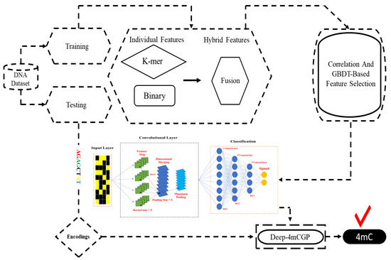 To tackle these hitches, we constructed a 1D CNN model to recognize 4mC sites in Geobacter pickeringii. Figure 1 illustrates the flowchart of the whole study. Binary and k-mer nucleotide composition descriptors were used to encode DNA sequences of Geobacter pickeringii into feature vectors and then these features were optimized by using a correlation and gradient-boosting decision tree (GBDT)-based algorithm with incremental feature selection (IFS) method. After this, these optimized features were inserted into 1D CNN-based classifier using 10-fold cross-validation and we attained the finest model to classify 4mC from non-4mC.