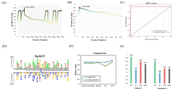 (A,B) The IFS technique for recognizing 4mC sites. Initially, 871 best features were picked from an overall 5624 by correlation measures (A). A total of 50 more optimized features were also attained from 871 best features by the using of GBDT on 10-fold CV. The Acc increases from 0.894 to 0.908 (B). Plot showing the AUROC curve of Deep-4mCGP on 10-fold CV (C). Nucleotides allocation along the alteration site (D). Performance comparison of Deep-4mCGP with 4mCCNN on 10-fold cross-validation (E). AUROC of predictors on training and independent data (F).