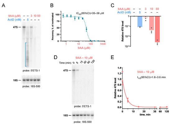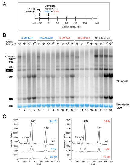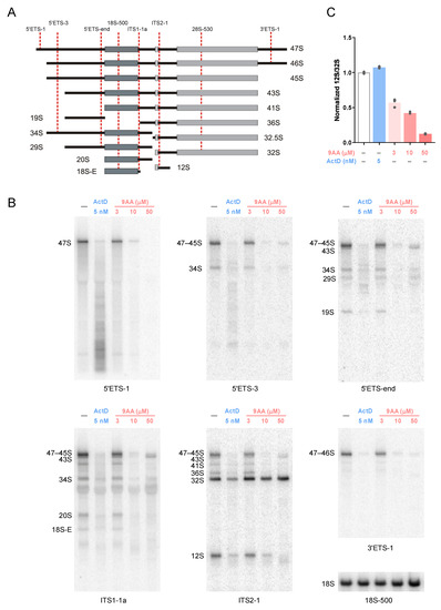Anikin, L.; Pestov, D.G. 9-Aminoacridine Inhibits Ribosome Biogenesis by Targeting Both Transcription and Processing of Ribosomal RNA. Int. J. Mol. Sci. 2022, 23, 1260. https://doi.org/10.3390/ijms23031260