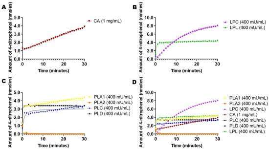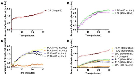 Hydrolysis of 4-nitrophenol palmitate catalyzed by different esterases present in the circulatory system at 400 mU/mL except CA (1 mg/mL). Enzyme kinetics were recorded via absorbance at 400 nm. The uncatalyzed hydrolysis of 4-nitrophenyl palmitate was deducted from the rate of catalyzed reaction observed. The amount of 4-nitrophenol released was determined against a calibration curve (Supplementary Materials, Figures S3 and S4). (A) Hydrolysis with CA. (B) Hydrolysis with lipases (LPC and LPL). (C) Hydrolysis with Phospholipases (A1, A2, C and D). (D) Hydrolysis with all esterases and lipases combined.