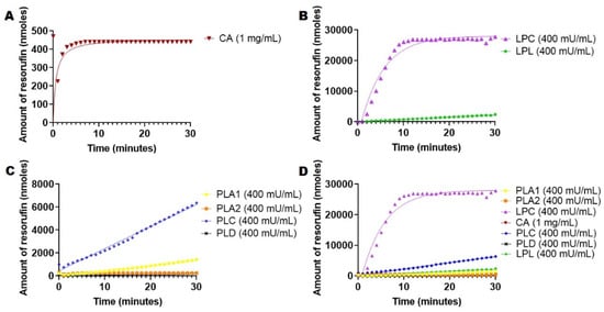 Data from Figure 3 showed that LPC released the highest amount of resorufin compared to the rest of the enzymes, peaking at about 25,000 nmols product in 30 min. (Figure 3A,D). Data from Figure 3A revealed that CA had the lowest catalytic activity, which was limited to about 400 nmols released in 30 min. PLA1 and LPL both appeared to have similar catalytic activities of about 1500 nmols and 2300 nmols produced in 30 min, respectively. PLC hydrolyzed DGGR at a rate of about 2000 nmols in 30 min. Overall, lipases and esterases were able to process and hydrolyze DGGR at a higher rate than 4-nitrophenyl acetate and 4-nitrophenyl palmitate, thus revealing the impact of substrate structure and lipophilicity on esterase and lipase activities.