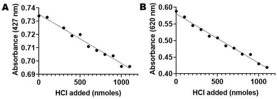 Calibration curve of BTB in the presence of acid. A BTB calibration curve was produced to determine BTB absorbance variations in the presence of increased amounts of acid. A stock solution of 0.05 mM BTB in ethanol:HBS 1X was created by diluting 20X BTB stock with HBS 1x pH 7.4. In a quartz cuvette, 1 mL of 0.05 mM Bromothymol blue in HBS 1X was equilibrated for 10 min at 37 °C, and absorbance was recorded at 427 nm and 620 nm. Aliquots of 10 µL HCl 10 mM stock were added, and the absorbance was recorded at 427 nm and 620 nm after each addition. The absorbance at 427 nm and 620 nm was plotted (Figure 4A,B). Linearity was observed up to an amount of 1000 nmols of HCl added. R2 values were 0.9808 and 0.9877 (Figure 4A,B).