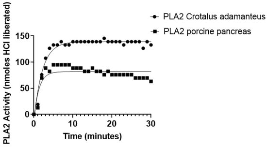 The results presented in Figure 5 revealed that the addition of PLA2 from Crotalus adamanteus released about 140 BTB nmols HCl after 5 min incubation time, while PLA2 from porcine pancreas peaked at about 95 nmols of HCl was released after 5 min with a deviation from the hyperbolic curve. No additional products were formed for the rest of the study (up to 30 min incubation time, See also Supplementary Materials, Figure S8). The results can be explained by considering that Cunningham et al. studied the product inhibition of venom group IA sPLA2 in in vitro conditions with plasma and ex vivo conditions with rats, and they concluded that lysophosphatidylcholines act as uncompetitive inhibitors on sPLA2s and, at high substrate levels, caused deviations from normal hyperbolic curves []. They also concluded that, according to the scooting theory, sPLA2 cleaves the ester and releases lysoPC []. At high concentrations of free or desorbed lysoPC, it causes inhibition of enzymatic activity [], which can help explain the curves of Figure 5.
