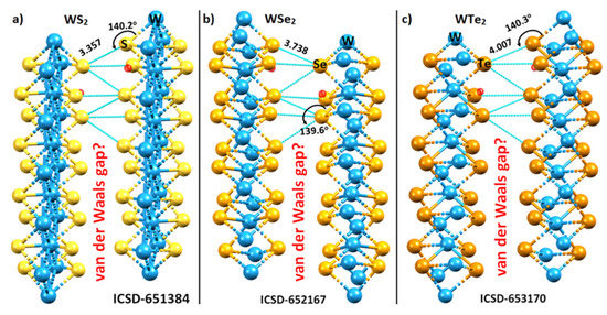 The inter-layer contacts (dotted lines in cyan) between the tungsten bonded Ch sites in the WS2, WSe2, and WTe2 crystals of the 2H phase, in which the 4 × 1 × 1 supercells were used, are shown in Figure 2. The contacts are illustrated within the framework of the respective unit cells.
