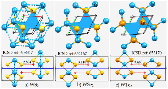 The top and side views of the unit-cells of (a) WS2, (b) WSe2, and (c) WTe2 in the 2H-phase, consisting of hexagonal triatomic layers, Ch–W–Ch, with a plane of metal atoms bound to two planes of chalcogen atoms (see Figure 1). The Inorganic Crystal Structure Database (ICSD) references to the structures are given. The distance between the W-bonded Ch site in an WCh6 unit in a monolayer and the centroid of the triangular face formed by three nearest Ch sites in the same unit in the neighboring layer (tiny red sphere) is shown in Å. Each structure is crystallized in the space group P63/mmc.