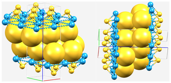 Illustration of combined ball-and-stick and space-filling views of the gapless WS2 crystal system in the 2H-phase. The tungsten-bonded S atoms (large yellow spheres) belonging to two different monolayers are “kissing” each other in the interface region, thus making the interfacial/interlayer region gapless. This may be likened to the concept of “kissing spheres” in coordination chemistry [57,58,59].