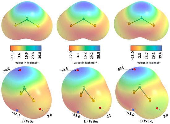 The most prominent negative region shows up on the surface of the junction region between the two Ch atoms in WCh2. The largest of these is found on the surface of the WTe2 molecule, with VS,min = −13.0 kcal mol−1 (Figure 5c).