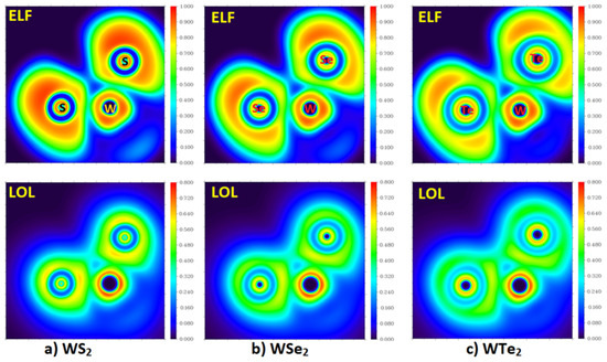 The 2D maps of the ELF and LOL functions for the molecular plane defined by the two Ch atoms and one W atom for the three WCh2 monomers are shown in Figure 6. Based on its definition, the ELF should range between 0 and 1 [71,79]. ELF = 1 corresponds to perfect localization and ELF = ½ corresponds to an electron gas. An ELF value close to 1 means that electrons are localized, implying a covalent bond, a lone pair, or inner shells of the atom involved. The value range of LOL is identical to ELF, but in the color bar in Figure 6 (bottom), the range is limited to between 0 and 0.8, corresponding to bonding and non-bonding attractor profiles. As can be seen from the 2D maps of ELF, the core regions of each atomic domain in each of the three monomers feature circular localization domains and have high ELF and LOL values close to 0.9. No strong localization is evident in the bonding regions between W and Ch in the three monomers, consistent with the multiple character of the W–Ch bonds.