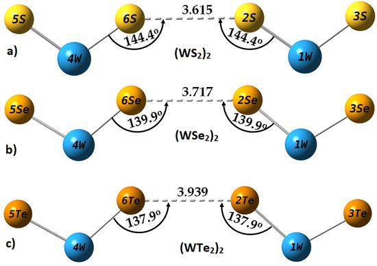 Three V-shaped WCh2 monomers and the three (WCh2)2 dimers were examined in this study using the DFT-M06-2X functional. The construction of the dimers was made possible by inspecting the geometry of the interfacial region between the WCh2 layers, reported in the crystals of WCh2 in the solid state [2,4,117,118].