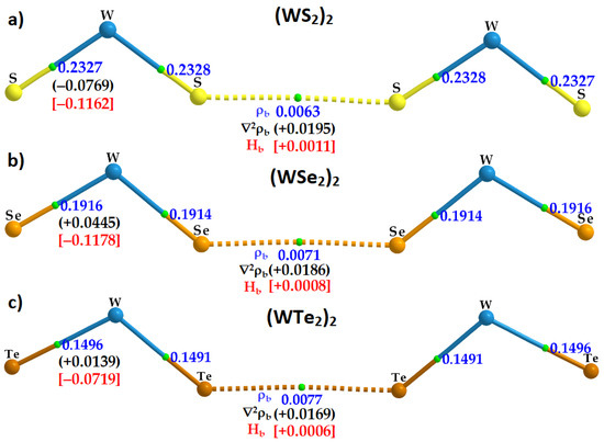 The QTAIM description of bonding interactions present in each (WCh2)2 dimer can be rationalized from the molecular graphs shown in Figure 8. As expected, they all show bond paths (line in atom color) and bond critical points (bcp, tiny spheres in green) between bonded atomic basins, indicative of chemical bonding between them [85]. QTAIM’s bond path descriptors do not just identify atom–atom links between molecular domains [86], but also allow for the recognition of various other interactions [87,88]; for example, between delocalized bonds in one molecular entity and the positive or negative site in another entity, as observed, for example, in Ti bonding to hydrocarbons [89].