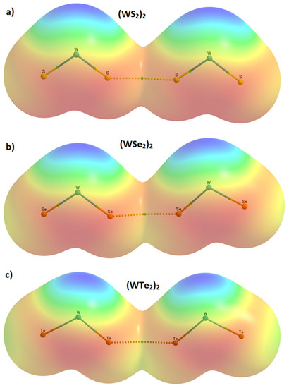 For quantum chemical systems in the gas phase, and within the framework of QTAIM, the van der Waals isosurface of a molecular entity is often defined as the ρ = 0.001 a.u. density envelope. The closest distance between a nucleus in a molecular entity and its van der Waals surface is called a “non-bonded atomic radius” [90]. Thus, for a non-covalently interacting pair of atoms A and B, the difference between the bond length of A···B and the sum of their non-bonded radii is regarded as the “mutual penetration distance” [91,92] between the van der Waals sphere of bonded atomic basins. It has been argued that this is a necessary and sufficient condition to identify hydrogen bonding in complex systems [93], and is transferable to other interactions. On this basis, in the case of (WS2)2, (WSe2)2, and (WTe2)2, the non-bonded radii of S2/S6, Se2/Se6, and Te2/Te6 atomic domains (see Figure 7) are calculated to be 2.134, 2.218, and 2.386 Å, respectively; twice these non-bonded radii are 4.268, 4.436, and 4.772 Å, respectively. Clearly, the difference between the calculated Ch2···Ch6 bond distance (see Table 1) and the twice non-bonded radius is 0.653, 0.719, and 0.834 Å for the (WS2)2, (WSe2)2, and (WTe2)2 dimers, respectively, suggesting that the mutual penetration between the two Ch sites responsible for the intermolecular region is strongest in (WTe2)2. Since the larger the mutual penetration distance between bonded atomic basins, the stronger the interaction between them, this accords with the trend observed in the binding energy of the dimers (Table 1 and Table 2).