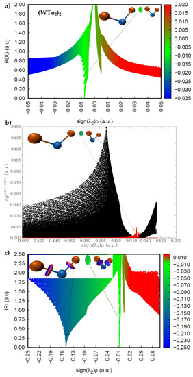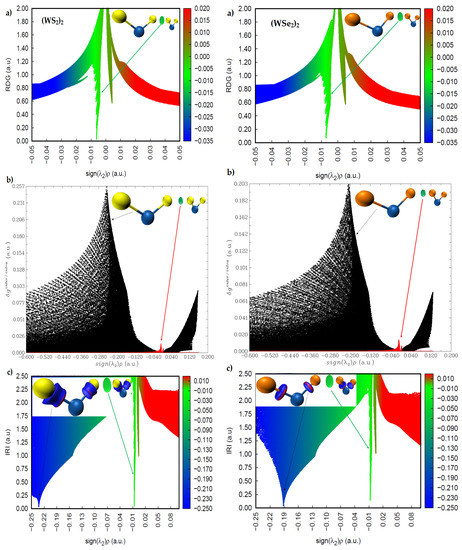 The more recently proposed IRI model [48] has an advantage over these two models above. It can not only provide insight into the presence of likely intermolecular interactions between the atomic domains, but can also give insight into the intramolecular interactions with the framework of isolated molecules. IRI relies on the charge density and its gradient to identify the inter- and inter-molecular interactions in molecular entities; IRI is simply the ratio between the charge density and its gradient norm. In other words, IRI is the gradient norm of the electron density weighted by the scaled charge density [48]. Figure 10c and Figure 11c show sign(λ2) × ρ vs. IRI for the dimers (WS2)2 and (WSe2)2, respectively, whereas that of the dimer (WTe2)2 is shown in Figure 11c. Two types of isosurfaces are evident. Those colored blue (dumbbell- and circular-disc-shaped) are a consequence of covalent bonding between W and Ch atomic basins. Those with a greenish color signal are the non-covalently bonded atomic basins of Ch atoms. Both isosurfaces were obtained with an IRI isovalue of 1.0 a.u., which is rather different to values of 0.4 and 0.01 a.u. used for RDG-NCI and IGM-δg models, respectively, as each model requires a specific range of isovalues to generate isosurfaces of interest. The blue isosurfaces signify a significant accumulation of the charge density in the bonding region between W and Ch atomic basins, as expected for ionic bonding with some covalent character. The green isosurfaces indicate low-density regions, as similarly observed in the RDG and IGM-δg plots that appear between the non-covalently bonded Ch atoms. The spikes in the sign(λ2) × ρ vs. IRI plots corresponding to these isosurfaces are identical to those of the sign(λ2) × ρ vs. IGM(δginter/intra) plots, indicating that both models provide a similar insight into the atomic basins causing the interactions and their strengths.
