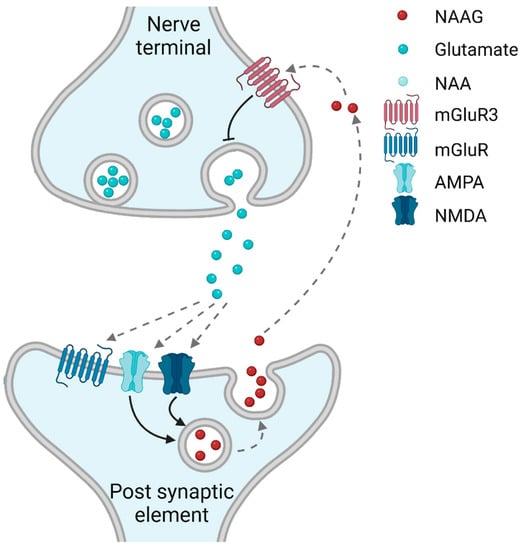 NAAG binds with high affinity to metabotropic mGluR3 (EC50 levels of 11–100 µM have been reported [10], depending on the assay conditions; and an IC50 < 5 μM was found in a displacement assay with the mGluR group II agonist LY354740). NAAG also binds with lower affinity to ionotropic NMDA receptors (EC50: 666 μM) [11]. Through these mechanisms, NAAG induces responses on pre-, post-, and extra-synaptic sites [12,13]. The main effect, however, appears to be through the activation of presynaptic mGluR3 [10,14], leading to the decreased release of glutamate [15]. In humans, mGluR3 is strongly expressed in the neocortex, caudate putamen, and substantia nigra, with low to moderate expression in the hippocampus, amygdala, and thalamus [16]. Contrary to what is seen in rodents, no mGluR3 appears to be present in human white matter [16]. In mice, mGluR3 has a predominantly presynaptic localization in glutamatergic synapses in the striatum and thalamus [17], but in layer III of the dorsolateral prefrontal cortex of monkeys [18] and the molecular layer of the dentate gyrus in mice [17], mGluR3 is also located in dendritic spines and astrocytic processes. Additionally, a localization on astrocytes is supported by combined in situ hybridization and immunohistochemistry, although also in this set-up, neuronal localization dominate [19]. In presynaptic terminals, mGluR3 is typically located outside of the active zone [17], see Figure 1.
