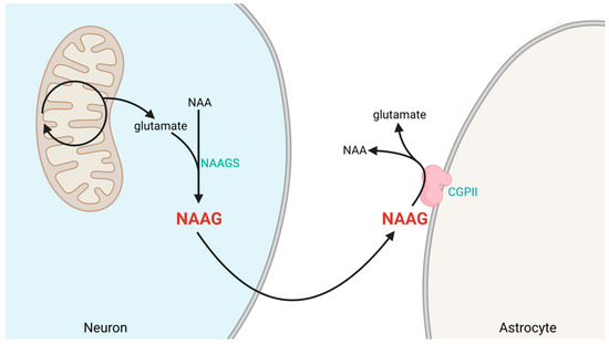 NAAG released to the synaptic cleft is rapidly inactivated through enzymatic degradation. Two zinc metallopeptidases, glutamate carboxypeptidase II (GCPII) and III (GCPIII), belonging to the transferrin superfamily are responsible for the cleaving of NAAG to NAA and glutamate. The higher expression levels of GCPII compared to GCPIII make GCPII the main enzyme involved in NAAG degradation. GCPII is expressed almost exclusively on the plasma membrane of glia, with the catalytic site facing extracellularly. In particular, GCPII is expressed at high levels extracellularly on astrocytes [33] and at lower levels on microglia [34]. GCPIII, on the other hand, localizes more to cerebellar and cortical neurons and less to astrocytes. The latter enzyme and its effects on NAAG neurotransmission have not been studied in detail; focus has been on the effects of GCPII. For visual illustration of NAAG metabolization, see Figure 2.