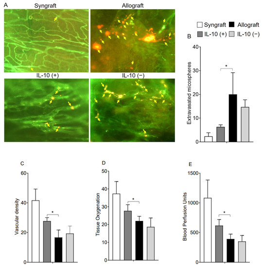 IL-10 is a vital reparative cytokine that plays a key role in donor microvasculature and, thereby, affect both hypoxic and ischemic state during rejection. While the effects of IL-10 blockade on immune suppression already emphasized the vital therapeutic significance in maintaining immune tolerance during transplant rejection [2,36], here, we further delineated the effects of IL-10 modulation on early microvascular leakiness, graft oxygenation, and microvascular blood flow during rejection. To test this, we performed microvascular leakiness and real-time measurements of tissue oxygenation (mmHg) and blood flow (Blood Perfusion Units) in syngrafts, untreated control allografts, as well as in IL-10 (−) and IL-10 (+) allografts at early d6 post-transplantation (Figure 1A–E). Our microvascular leakiness data demonstrated that both untreated control allografts and IL-10 (−) allografts showed a significant microvascular leakiness (p < 0.05) and consequently, showed a significantly hypoxic and ischemic phase (p < 0.05) as compared to corresponding syngrafts and IL-10 (+) allografts at d6 post-transplantation. These findings support the notion that IL-10 is directly/indirectly associated with microvascular reestablishment, which proportionally affects blood flow in the graft and oxygenation state during inflammation. (Figure 1A–E).