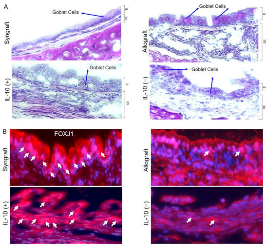 Microvasculature plays a crucial part in graft survival; therefore, these microvascular injuries impact the graft pathological structures during rejection. IL-10 takes an active part in tissue epithelium repair and wound healing, and thus, here, we investigated graft airway epithelium, specially goblet cells, after IL-10 mediated immunomodulation. To investigate the goblet cells hyperplasia, we performed Periodic acid–Schiff (PAS) staining of grafts and RT-PCR analysis in all experimental groups, which demonstrate a significant drop in epithelial goblet cells deposition post-IL-10 (+) compared to IL-10 (−) allografts at d10 post-transplantation (Figure 2A). Moreover, all corresponding tissue samples were immunostained for FOXJ1 expression (ciliated cells of airways) at d10 post-transplantation, and semi-quantitative analysis demonstrated a significant increase in FOXJ1 expression in syngrafts and IL-10 (+) allografts as compared to corresponding IL-10 (−) and untreated control allografts (Figure 2B).