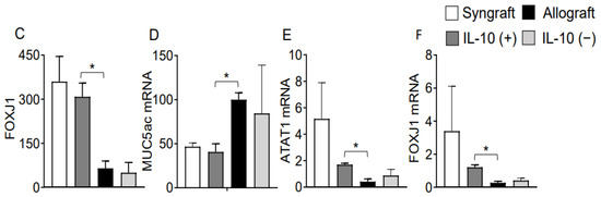 Moreover, RT-PCR data of both syngrafts and IL-10 (+) allografts at d10 post-transplantation demonstrate an upregulation of regulatory phenotypes (FOXP3), associated regulatory mediators (IL-5, TGF-β, TSG-6) and airway epithelial repair mediators (ATAT1, and FOXJ1) as compared to untreated control allografts and IL-10 (−) allografts, which shows that IL-10 presence is sufficient to affect pathological changes. On the contrary, both untreated control allografts and IL-10 (−) allografts demonstrate an upregulation of major inflammatory phenotypes (STAT3, STAT5, Tbet, GATA3, and TIGIT), associated inflammatory mediators (IL-1β and IL-6), and airway epithelial injury mediator (MUC5ac) at the corresponding day post-transplantation (Figure 2C–F and Figure 3A–L).
