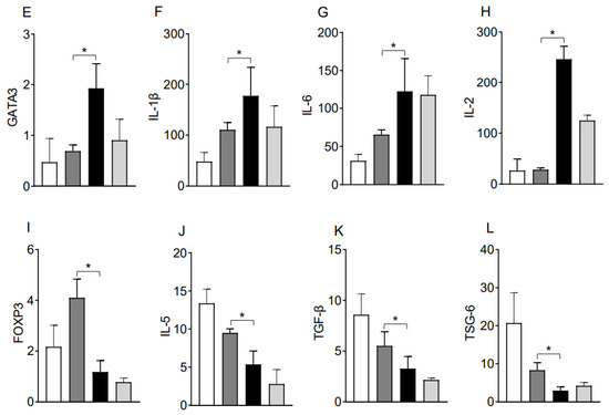 IL-10 is sufficient to promote the activation of regulatory genes. Quantitative RT-PCR analysis of grafts shows the fold change in mRNA of (A–H) inflammatory transcription factors and associated cytokines genes and (I–L) regulatory transcription factors and associated cytokines genes in control and IL-10-treated allografts at d10 post-transplantation. Data are shown as means with SE 12 transplants/time point/experiment. * p < 0.05.